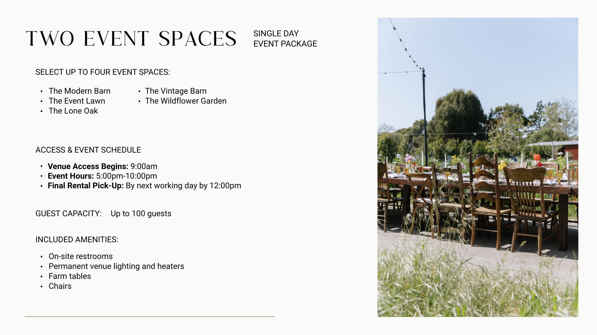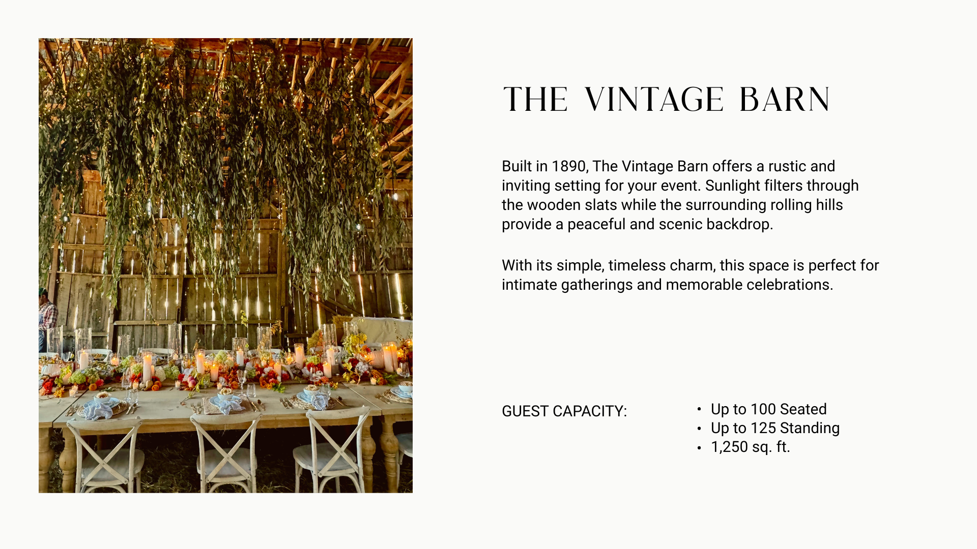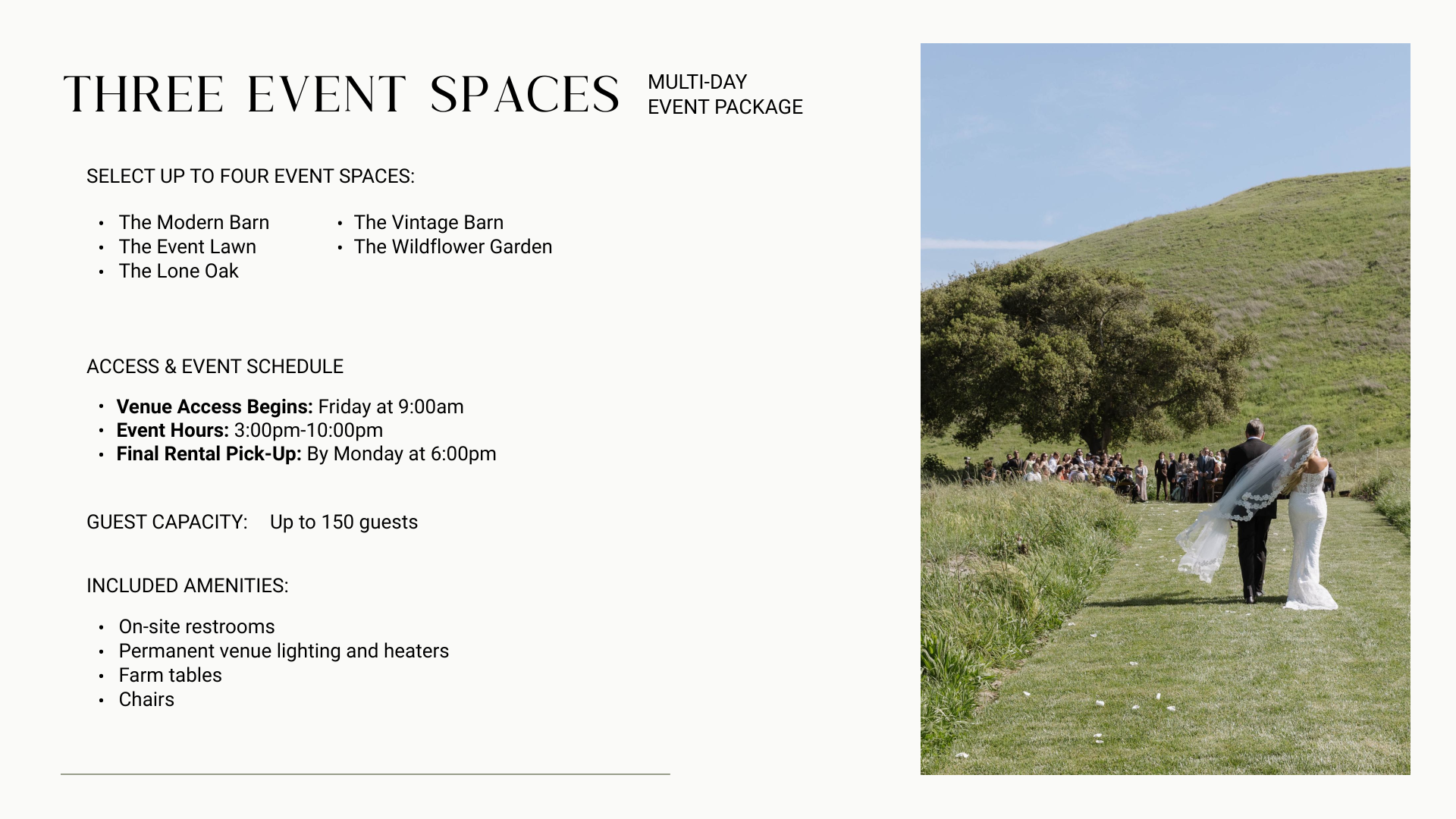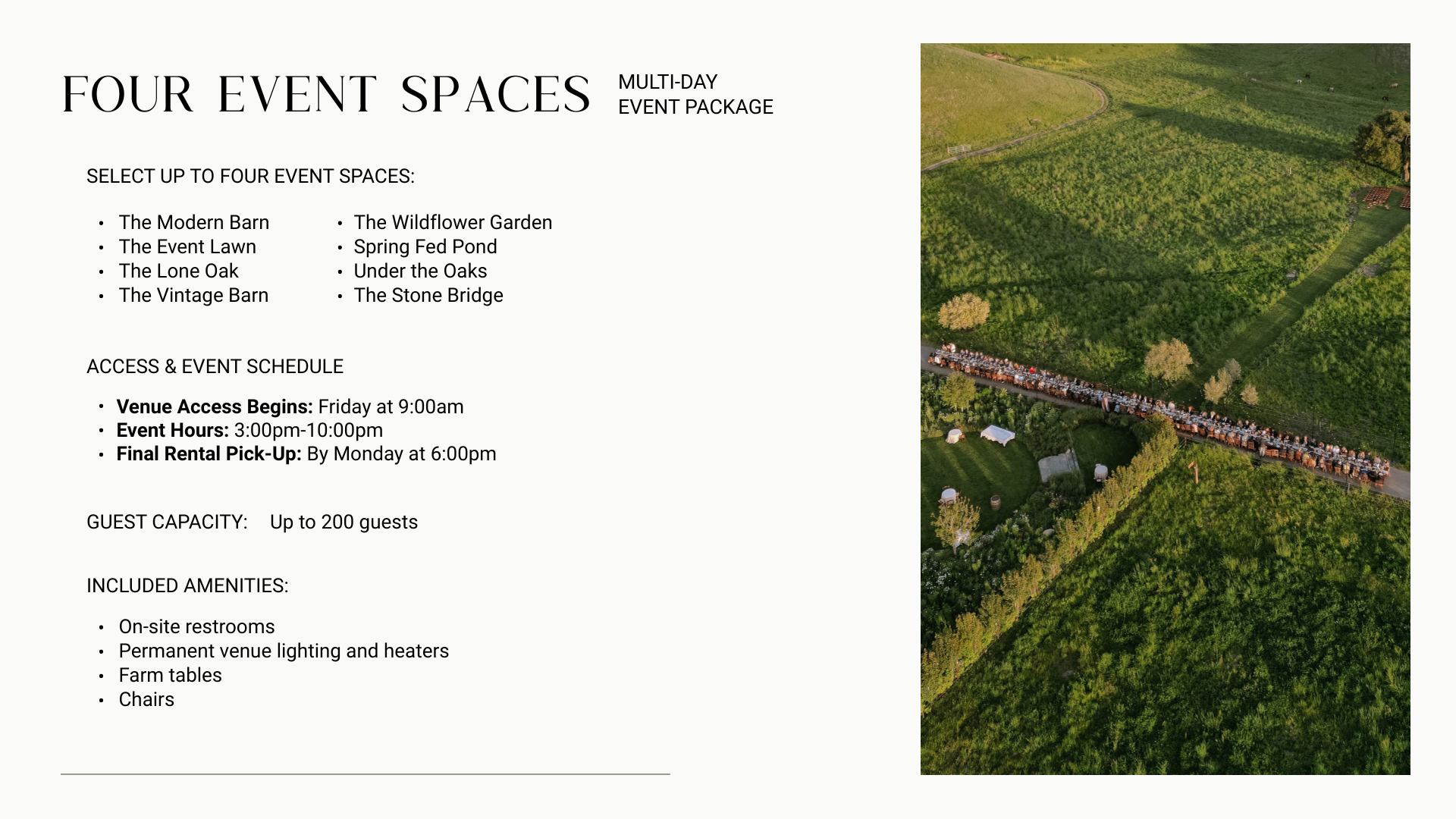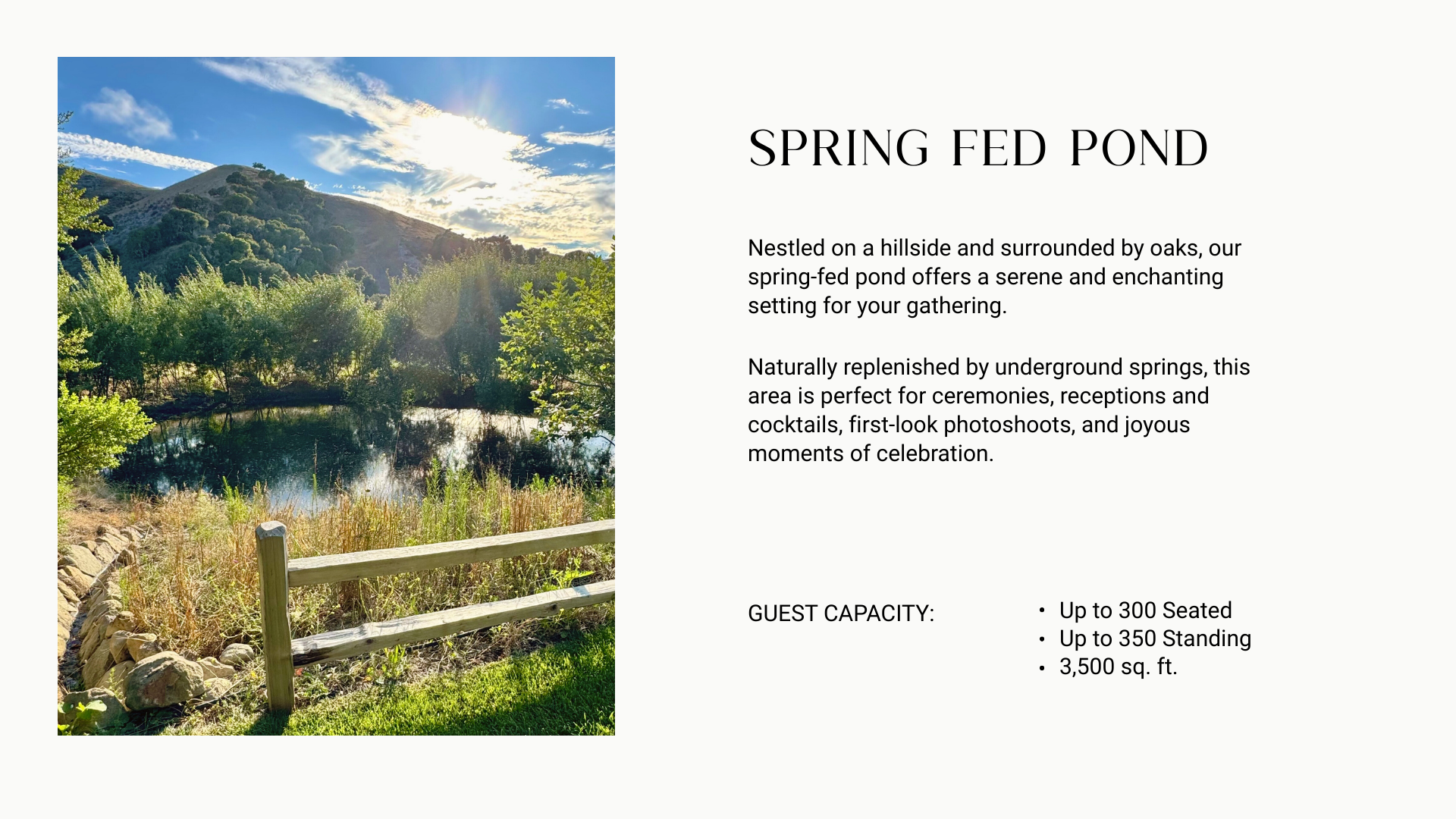 Customizable event spaces that reflect your unique style. Such as the vintage barn, and the modern barn, the wildflower gardens, the spring fed pond, the oaks groves and much more.