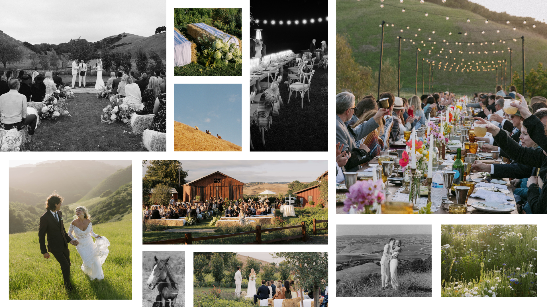 Under an endless open sky in Santa Barbara County, a ceremony unfolds on sprawling green grass, surrounded by rolling hills where wild mustangs graze in the distance. After the vows, guests wander to the wildflower garden, where blooms and signature cocktails await. A long table set with porcelain dinnerware, crystal glassware, hurricane candelabras, and wildflower bouquets shimmers in the soft light. As the sun dips below the horizon, casting a golden glow across the hills, string lights flicker to life, creating a romantic atmosphere as guests dance beneath a sea of stars.