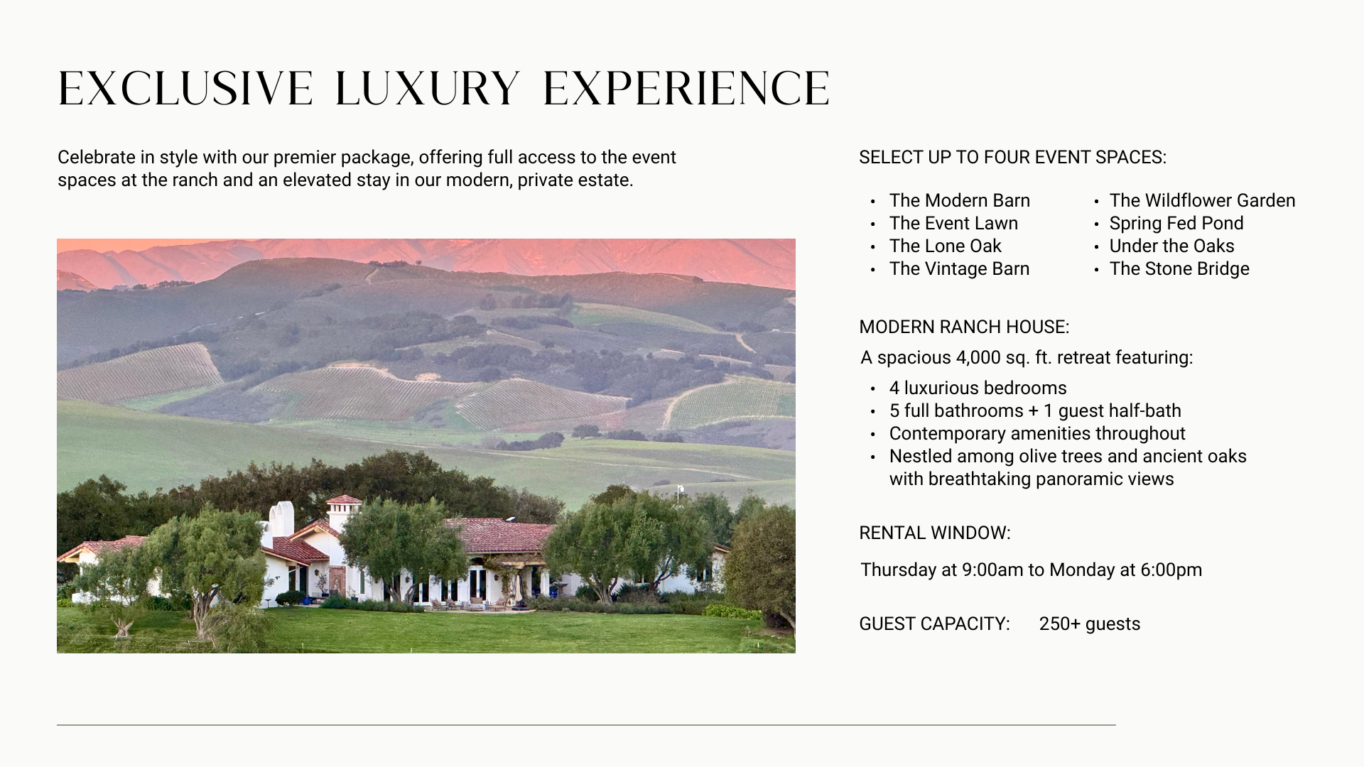 Where golden hills meet wide open skies, the Ranch offers the perfect blend of rustic charm and timeless elegance.